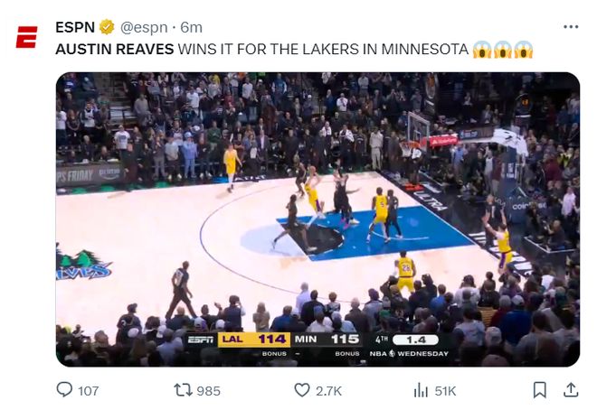 裡夫斯也直接登上瞭全美第一熱搜,裡夫斯這場(chǎng)比賽的手感並不好,但他命中瞭制勝一球他就是這個(gè)夜晚的第一超巨。