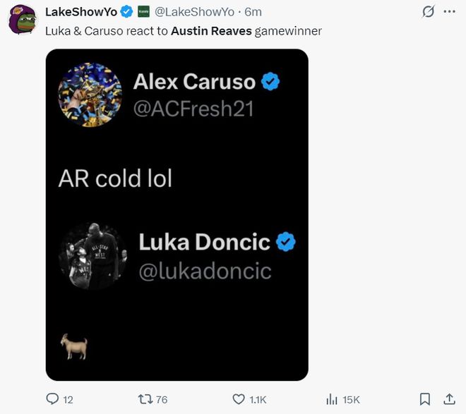 卡魯索與東契奇都在IG上對(duì)裡夫斯的表現(xiàn)做出瞭評(píng)價(jià),東契奇又來(lái)一次GOAT。