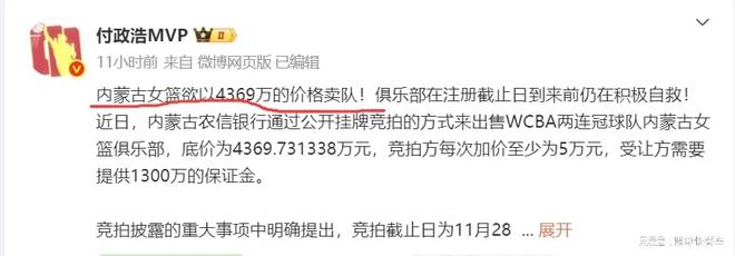 中國(guó)女籃又一次遭遇打擊瞭。作為曾經(jīng)的女籃聯(lián)賽霸主,內(nèi)蒙古女籃在前陣子傳出過(guò)退賽後,近日,他們又再度成為瞭焦點(diǎn),這一次,他們竟然開始公開甩賣球隊(duì)瞭。根據(jù)數(shù)據(jù)顯示,內(nèi)蒙古女籃準(zhǔn)備以4369萬(wàn)元的價(jià)格賣隊(duì),不過(guò),截止到目前,並沒(méi)有任何企業(yè)願(yuàn)意接手,隨著WCBA新賽季註冊(cè)截止日期的臨近,內(nèi)蒙古退出WCBA聯(lián)賽,已經(jīng)是板上釘釘?shù)氖聦?shí)。