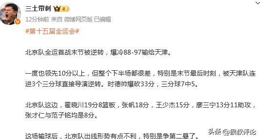 媒體人“孔德昕”發(fā)文點(diǎn)評(píng):“天津末節(jié)逆轉(zhuǎn)戰(zhàn)勝北京,北京可能要去爭(zhēng)成績(jī)最好的小組第三瞭”。