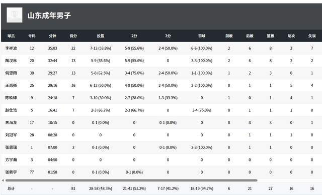 從數(shù)據(jù)來看,山東隊(duì)4人得分上雙,李祥波13投7中,拿到22分8籃板3助攻7失誤,陶漢林9投5中,拿到13分8籃板2助攻,何思雨13分3籃板,王嵐欽12投6中,拿到16分5助攻4失誤。