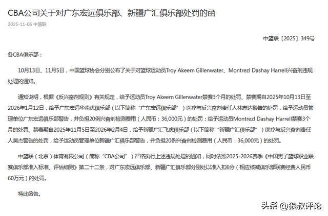 通知說(shuō)明,根據(jù)《反興奮劑規(guī)則》有關(guān)規(guī)定,給予運(yùn)動(dòng)員Troy Akeem Gillenwater禁賽3個(gè)月的處罰、禁賽期自2025年10月13日至2026年1月12日,給予廣東宏遠(yuǎn)華南虎俱樂部(以下簡(jiǎn)稱“廣東宏遠(yuǎn)俱樂部”)醫(yī)療與反興奮劑責(zé)任人林志達(dá)警告的處罰,給予運(yùn)動(dòng)員管理單位廣東宏遠(yuǎn)俱樂部警告,並負(fù)擔(dān)20例興奮劑檢測(cè)費(fèi)用(人民幣:36,000元)的處罰;給予運(yùn)動(dòng)員Montrezl Dashay Harrell禁賽3個(gè)月的處罰、禁賽期自2025年11月5日至2026年2月4日,給予新疆廣匯飛虎俱樂部(以下簡(jiǎn)稱“新疆廣匯俱樂部”)醫(yī)療與反興奮劑責(zé)任人吳傑警告的處罰,給予運(yùn)動(dòng)員管理單位新疆廣匯俱樂部警告,並負(fù)擔(dān)20例興奮劑檢測(cè)費(fèi)用(人民幣:36,000元)的處罰。
