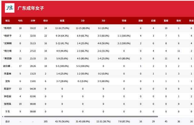 廣東隊(duì)多達(dá)6人得分上雙,陳明伶24分10籃板,楊舒予22分7籃板5助攻,楊力維10分4籃板11助攻,武桐桐16分8籃板6助攻,黃思靜15分11籃板6助攻,迪拉娜10分3籃板。