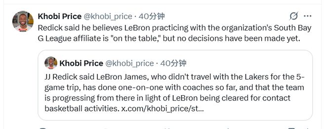 主帥雷迪克在訓練後更新瞭詹姆斯的情況。雷迪克透露,未隨湖人隊參加五連客之旅的詹姆斯,目前已與教練進行過一對一訓練。鑒於詹姆斯已獲準參與對抗性籃球活動,球隊正以此為基礎逐步推進他的復健進程。雷迪克還表示,他認為詹姆斯與下屬的發(fā)展聯(lián)盟球隊南灣湖人合練“是有可能的”,但目前尚未做出最終決定。