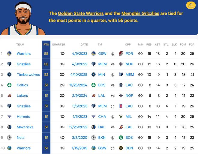 在2023年4月9日,勇士在客戰(zhàn)開(kāi)拓者的首節(jié)比賽中拿到瞭55分;在2022年4月9日,灰熊在主場(chǎng)對(duì)陣鵜鶘的比賽中的第三節(jié)拿到瞭55分。