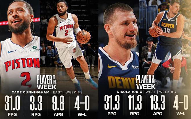 在這輪比賽之前,NBA官方公佈瞭上周的周最佳球員,坎寧安和約基奇分別當(dāng)選。其中,坎寧安上周率球隊(duì)取得瞭4勝0負(fù),場均可以得到31分3.3籃板9.8助攻。約基奇上周率球隊(duì)取得瞭4勝0負(fù),場均可以得到31.3分11.3籃板13.3助攻??矊幇策@賽季進(jìn)化還是很明顯的,打得是更有自信瞭,對(duì)抗提升的同時(shí),在場上失誤數(shù)減少,關(guān)鍵時(shí)刻打得往往特別強(qiáng)硬。而約基奇,不愧聯(lián)盟現(xiàn)役即戰(zhàn)力第一人啊,劃劃水就能拿到場均三雙,得分、籃板、助攻一把抓;本賽季,約老師估計(jì)又要和亞歷山大,字母哥他們競爭MVP瞭。