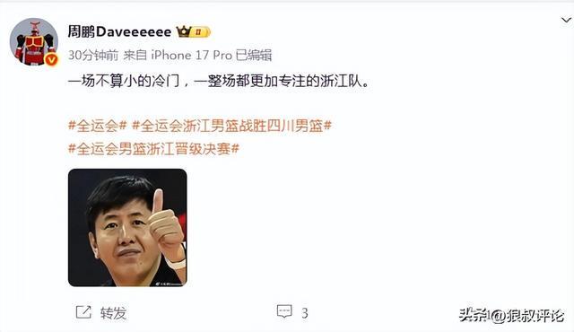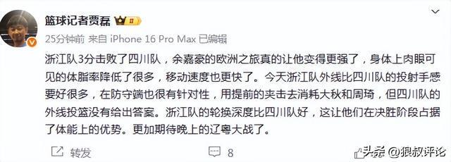 媒體人"趙探長(zhǎng)"發(fā)文點(diǎn)評(píng)“浙江80-77戰(zhàn)勝四川闖進(jìn)決賽!他們不光贏在第二陣容,整場(chǎng)的策略和決勝時(shí)刻的打法也更清晰和理智。”