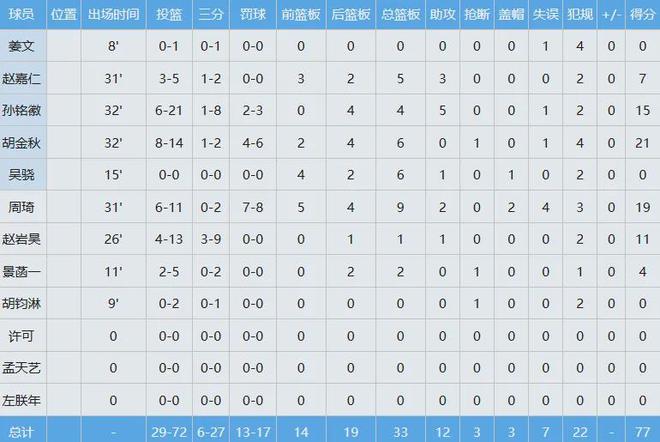 周琦+胡金秋,合砍40分15板都於事無補(bǔ),孫銘徽(投籃21中6)為首的外線群把籃筐砸爛,全隊(duì)三分球27中6,命中率低至可憐的約22%。