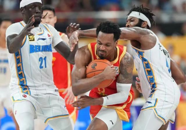 在2024-2025賽季CBA總決賽第五場比賽中,廣廈隊球員佈朗與北京隊球員傑曼和奧莫特在比賽中拼搶