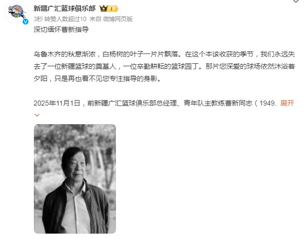 2025年11月1日,前新疆廣匯籃球俱樂部總經(jīng)理、青年隊(duì)主教練曹新同志(1949.10.15-2025.11.1)因病與世長(zhǎng)辭。新疆籃球的天空,有一顆星悄然隱沒。