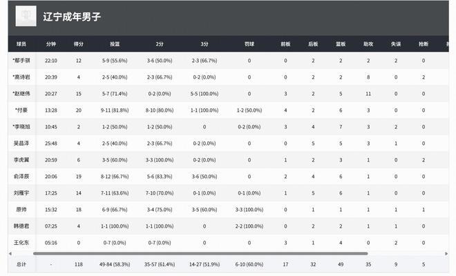 遼寧男籃:俞澤辰21分6板1助2帽、付豪20分5板3助、原帥18分1板1助、劉雁宇14分6板1助、趙繼偉12分4板9助、鄢手騏12分2板2助、韓德君7分1板、李虎翼6分4板1助2斷、高詩(shī)巖4分2板8助2斷。