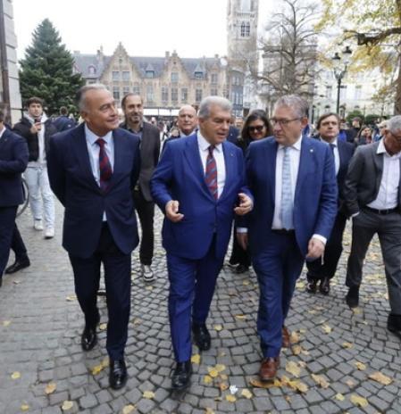 接待儀式結(jié)束后,巴薩代表團與市長一起步行十分鐘左右,穿過了布滿鵝卵石街道的歷史中心區(qū)域,沿途是標志性的運河和中世紀建筑,這使得布魯日成為比利時最具代表性的城市之一。輕松的氛圍讓拉波爾塔得以回應(yīng)一些在場球迷的問候,他們在主席漫步市中心時向他喊話。