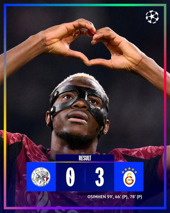 四屆歐冠冠軍得主被客場蟲狂虐,奧斯梅恩大演帽子戲法,幫助加拉塔薩雷3-0大勝阿賈克斯。阿賈克斯開賽至今4戰(zhàn)4負(fù),打進(jìn)1球狂丟14球,積分榜墊底。