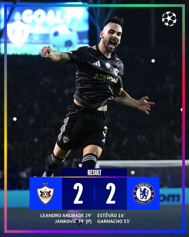 下半場7分鐘加納喬傳球被擋后左腳推射扳平,最終,首發(fā)身價僅1232萬歐的卡拉巴赫2-2逼平4.2億歐的切爾西。這是卡拉巴赫歐戰(zhàn)7次面對英超球隊拿到的第一分。