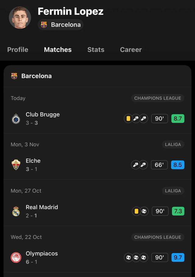 本賽季,奧爾莫狀態(tài)不佳、傷病頻繁,費(fèi)爾明再次抓住機(jī)會上位。過去4場比賽,費(fèi)爾明全部首發(fā)出場。歐冠6-1大勝奧林匹亞科斯,費(fèi)爾明上演帽子戲法;國家德比客場面對皇馬,費(fèi)爾明打入挽回顏面一球;西甲3-1擊敗埃爾切,費(fèi)爾明助攻雙響。本輪歐冠,費(fèi)爾明先是助攻費(fèi)蘭·托雷斯打入早早扳平的一球,下半場又助攻拉明·亞馬爾將比分扳為2-2。
