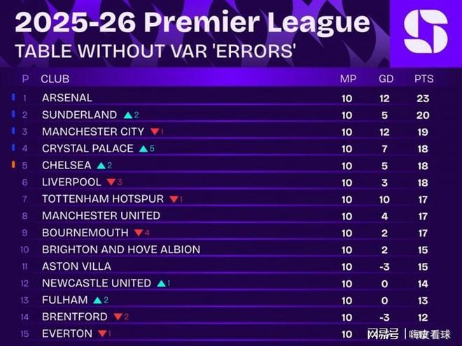 有趣的是,著名數(shù)據(jù)分析網(wǎng)站Squawka,統(tǒng)計瞭關(guān)於去除VAR爭議判罰的積分榜,阿森納仍高居第一,桑德蘭則上升到第二名,曼聯(lián)是為數(shù)不多名次沒有改變的球隊,是不是意味著,桑德蘭遭遇瞭更多不利判罰。