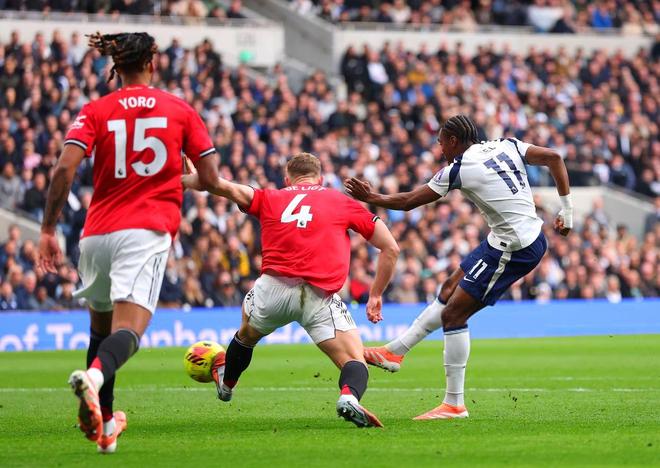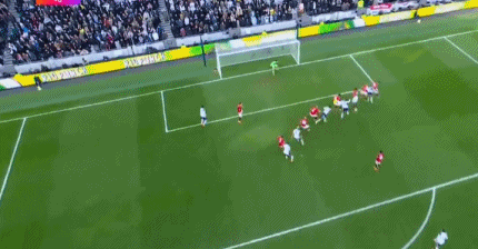 第32分鐘,熱刺後防線一片混亂,迪亞洛禁區(qū)右側(cè)傳中,姆伯莫後點甩頭攻門直掛死角,維卡裡奧鞭長莫及,曼聯(lián)打破僵局,1-0!