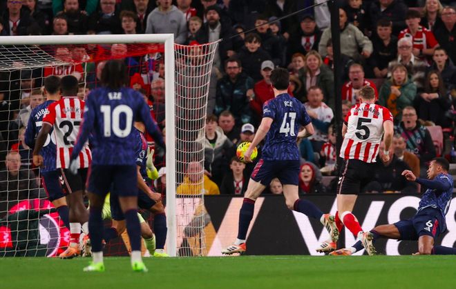 第53分鐘,賴斯前場搶斷,埃澤傳球,梅裡諾停頓一下後的助攻相當巧妙,薩卡低射破門。