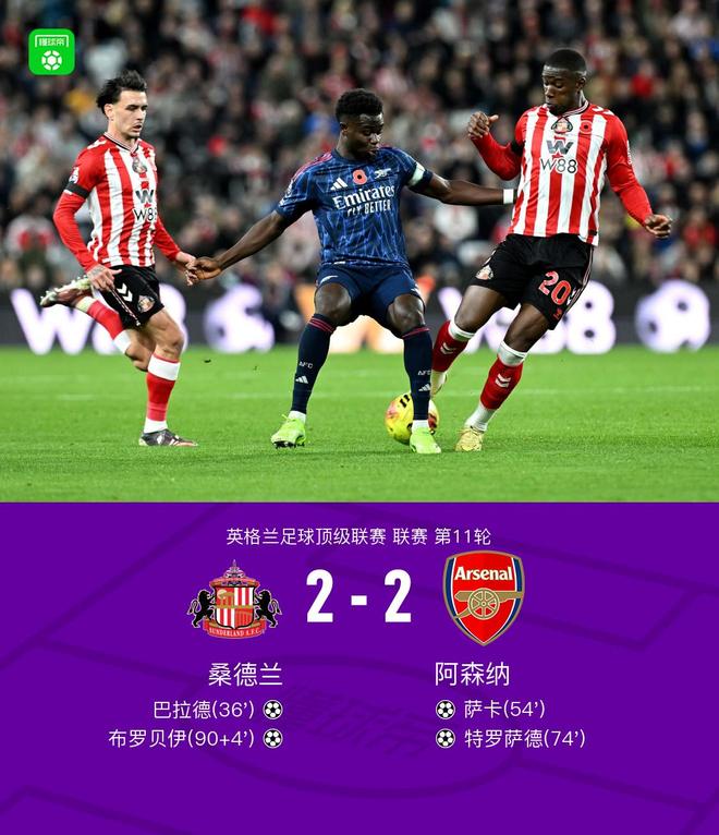 北京時(shí)間11月9日1:30,英超第11輪繼續(xù)進(jìn)行,阿森納作客光明球場挑戰(zhàn)桑德蘭,本場主裁判為克雷格-鮑森。上半場,穆傑萊助攻巴拉德破門。下半場,梅裡諾助攻薩卡扳平比分,特羅薩德世界波助阿森納反超;補(bǔ)時(shí)階段,佈羅貝伊高難度凌空破門絕平。最終,阿森納客場2-2戰(zhàn)平桑德蘭,各項(xiàng)賽事十連勝遭終結(jié)。