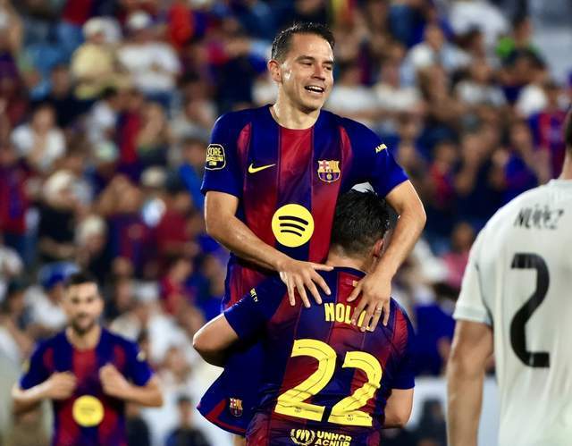 薩維奧拉梅開二度,巴薩傳奇隊友將“兔子”一把抱起慶祝。