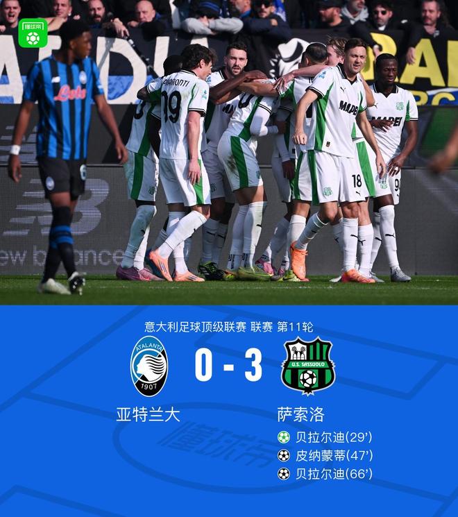 第67分鐘,貝拉爾迪單刀破門完成雙響,薩索洛3-0亞特蘭大