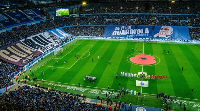 值得一提的是,本場比賽正是瓜迪奧拉執(zhí)教生涯的第1000場比賽,阿提哈德球場擺起瞭巨大的TIFO,幹向瓜迪奧拉致敬。
