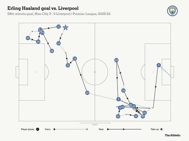 當(dāng)哈蘭德頭球頂入馬特烏斯-努內(nèi)斯的傳中時(shí),這意味著曼城所有10名外場球員都在這次縱貫全場的推進(jìn)中觸球瞭。整整20腳傳遞才造就瞭這次右路傳中,而這次進(jìn)攻片段也濃縮瞭主隊(duì)在上半場的統(tǒng)治力,他們總能神奇地多出一名接應(yīng)點(diǎn),從而化解瞭利物浦施加的任何壓迫。