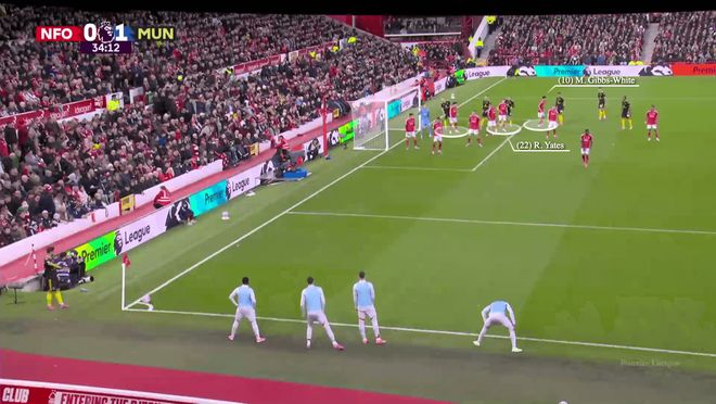 另一個例子來自本月2-2戰(zhàn)平諾丁漢森林的客場比賽。對手采用純粹的區(qū)域防守,內(nèi)科-威廉斯、耶茨和吉佈斯-懷特負(fù)責(zé)防守後點(diǎn)區(qū)域。