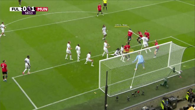 當(dāng)姆伯莫將內(nèi)旋角球開向後點(diǎn)時,盧克-肖在那個區(qū)域牽制住瞭富勒姆的區(qū)域防守球員羅德裡戈-穆裡斯。相應(yīng)地,約羅在目標(biāo)區(qū)域內(nèi)與巴錫形成一對一。