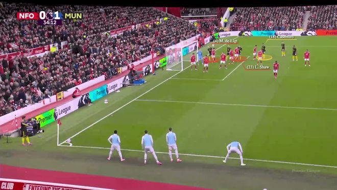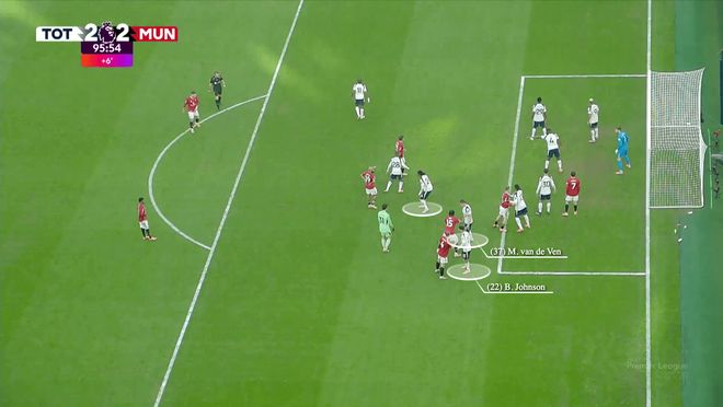 當(dāng)佈魯諾-費(fèi)爾南德斯開始助跑時,德利赫特(紅色)向?qū)Ψ介T將澤爾斯移動,而盧克-肖則靠近耶茨。謝什科(黑色)準(zhǔn)備攻擊後點(diǎn)。