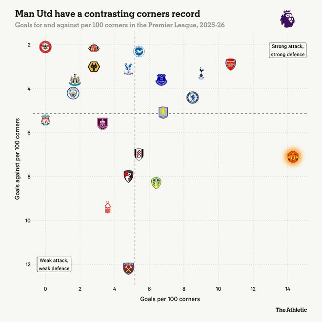 然而,他們的進(jìn)攻角球得分率(每100次角球攻入14.3球)在2025-26賽季的英格蘭頂級聯(lián)賽中高居榜首。