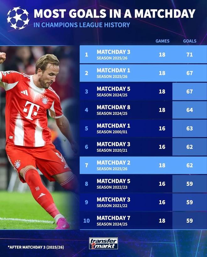 歐冠歷史單輪進(jìn)球數(shù)前10:本賽季第3輪71球第1,第1輪67球第2