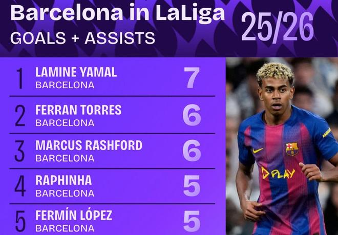 賽后根據(jù)Squawka的統(tǒng)計(jì),巴薩是本賽季至今歐洲五大聯(lián)賽中唯一一支有5名球員至少參與5粒聯(lián)賽進(jìn)球的球隊(duì),目前亞馬爾為巴薩在西甲貢獻(xiàn)了3球4助攻、費(fèi)蘭-托雷斯5球1助攻、拉什福德2球4助攻、拉菲尼亞3球2助攻,費(fèi)爾明-洛佩斯3球2助攻。
