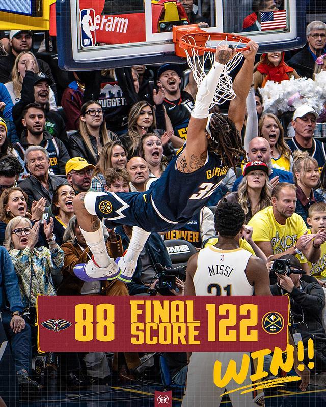 由於雙方比分相差懸殊,第四節(jié)比賽提前進入垃圾時間,雙方也是派上替補輪換陣容。末節(jié)雙方均是單節(jié)轟下30分,最終掘金122-88大勝送鵜鶘開局4連敗。