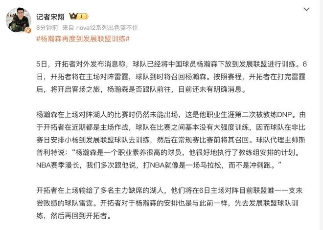 說(shuō)實(shí)話對(duì)於教練組來(lái)說(shuō),如果他們確實(shí)有比較具體的培養(yǎng)計(jì)劃的話,那應(yīng)該對(duì)外說(shuō)出來(lái),也可以讓大傢能夠更加安心的等待楊瀚森的成長(zhǎng)。如果確定楊瀚森不會(huì)上場(chǎng)的話,就沒(méi)有必要來(lái)回折騰,好像花瞭很大的陣仗把他下放然後又把他征召回來(lái),給瞭球迷希望最後再給大傢當(dāng)頭一棒,這種感覺(jué)其實(shí)是非常難受的。我們還是希望看到楊瀚森可以耐心的在發(fā)展聯(lián)盟升級(jí)打怪,逐漸提升自己的能力,後續(xù)一旦有機(jī)會(huì)回到NBA的常規(guī)賽賽場(chǎng),能夠得到上場(chǎng)的機(jī)會(huì)然後一舉證明自己。