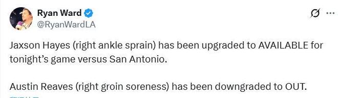 裡夫斯與東契奇均缺席瞭上一場對陣開拓者隊的比賽,盡管缺少兩位頭號得分手,湖人隊仍取得瞭一場令人印象深刻的勝利。不過東契奇並未出現(xiàn)在今日的傷病報告中,確認可以出戰(zhàn),而裡夫斯將至少再缺席一場。
