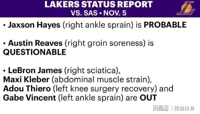 不過湖人也面臨不小的傷病困擾,後衛(wèi)裡夫斯因右側(cè)腹股溝酸痛,出戰(zhàn)狀態(tài)被標(biāo)註為“出戰(zhàn)成疑”,能否登場(chǎng)仍需賽前進(jìn)一步評(píng)估;而球隊(duì)核心詹姆斯則將繼續(xù)因右側(cè)坐骨神經(jīng)痛缺席,據(jù)此前消息,詹皇預(yù)計(jì)要到11月中旬才能重返賽場(chǎng)。除此之外,克勒貝爾(腹部肌肉拉傷)、蒂耶羅(左膝手術(shù)恢復(fù))以及文森特(左腳踝扭傷)也將因傷無緣本場(chǎng)對(duì)決,這對(duì)湖人的陣容深度提出瞭不小的考驗(yàn)。