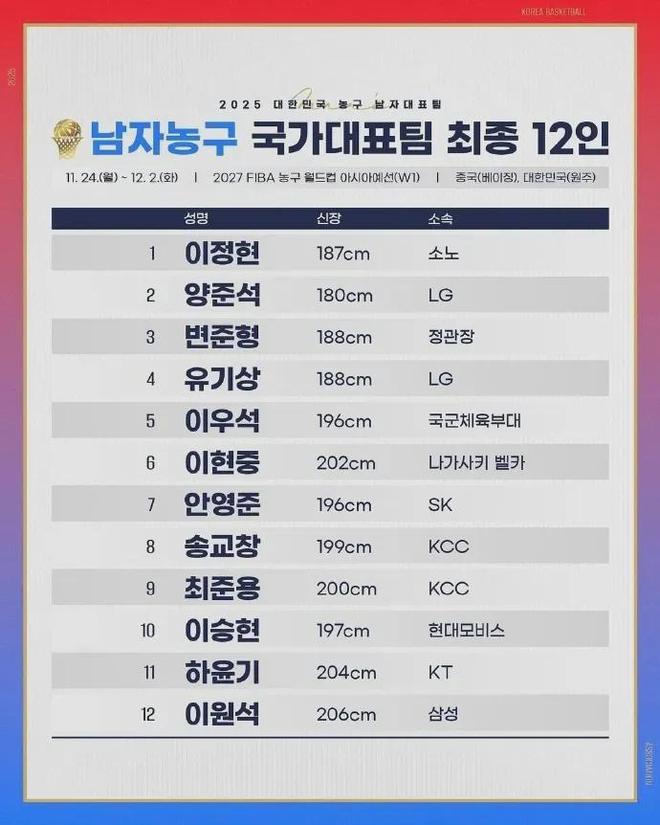韓國男籃則早早公佈瞭對陣中國男籃的12人大名單,最高2米06,由他們的當傢球星李賢重領銜,兩隊將繼今年亞洲杯八強賽之後再次相遇,如下: