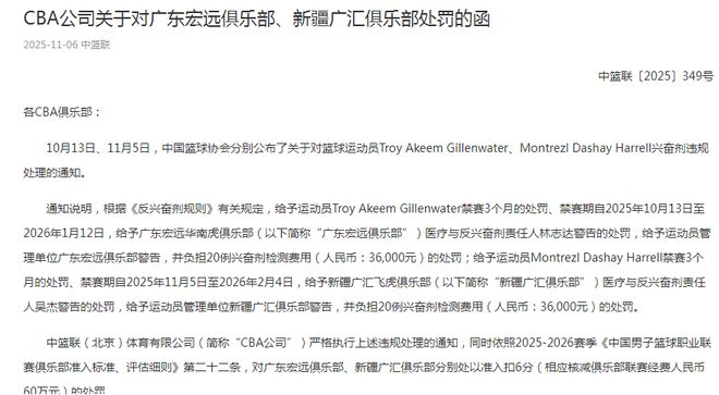 CBA官方:吉倫沃特哈雷爾興奮劑違規(guī) 廣東新疆扣6分核減經(jīng)費60萬