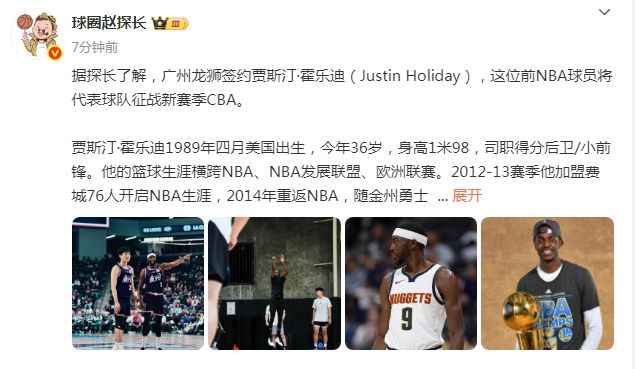 北京時(shí)間11月6日,根據(jù)媒體人球圈趙探長報(bào)道,廣州男籃簽約36歲的前勇士總冠軍球員賈斯汀-霍勒迪,他今夏已經(jīng)代表廣州男籃參加過NBA季前賽。