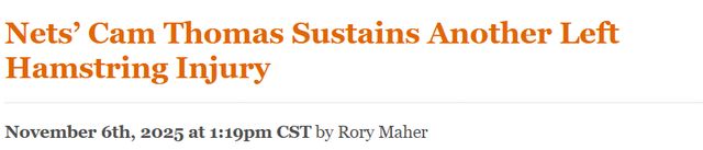 劉易斯指出,托馬斯在2024-25賽季曾三次傷到同一側(cè)的腿筋。這位24歲的球員在休賽期成為受限制自由球員,最終接受瞭600萬美元的資質(zhì)報(bào)價(jià),這讓他在2026年將有資格成為完全自由球員。如果他本賽季因腿筋問題再次缺席大量比賽,他期待的大合同可能就懸瞭。