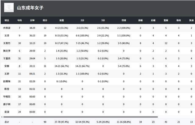 山東隊(duì)4人得分上雙,老將安靜21投14中,獨(dú)砍31分9籃板4助攻,王英竹17投8中,拿到19分12籃板,王澤19分4籃板4助攻,喬燕姿12分5籃板3助攻。