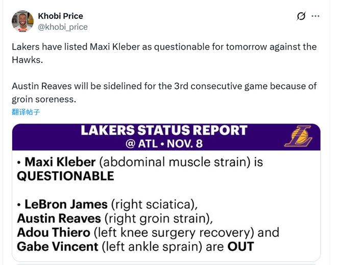 北京時間11月8日,湖人官方更新明日對陣老鷹的傷病報告,裡夫斯連續(xù)第三場比賽因腹股溝酸痛缺陣,同樣缺席這場比賽的還有詹姆斯、蒂耶羅和文森特??死肇悹柕臓顟B(tài)是出戰(zhàn)成疑。