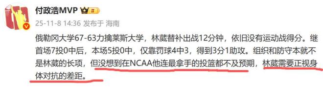 對於這兩場比賽林葳的表現(xiàn),媒體人付政浩也發(fā)文總結(jié)——組織和防守本來就不是林葳的強(qiáng)項(xiàng),但沒想到在NCAA,他連最基本的投籃都不達(dá)預(yù)期,林葳需要正視身體對抗的差距。