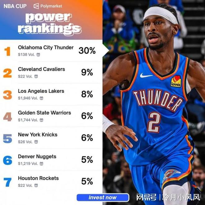 今日,美國預(yù)測平臺《PolyMarket》根據(jù)數(shù)據(jù)大模型公佈瞭本屆NBA杯(原季中賽)奪冠概率榜單,結(jié)果顯示雷霆以絕對的優(yōu)勢排在榜首,湖人排在瞭第三,具體排名為:1、雷霆30%,2、騎士9%,3、湖人8%,4、勇士6%,5、尼克斯6%,6、掘金5%,7、火箭5%。截至目前,湖人在NBA杯中取得瞭1勝0負的戰(zhàn)績,以凈勝分的優(yōu)勢(+5凈勝分,高於第二快船的+2)排在西部B組第一名。