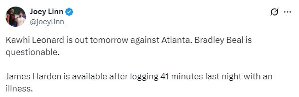 北京時間11月10日,NBA常規(guī)賽繼續(xù)進(jìn)行,快船官方公佈下一場對陣?yán)销椀膫蟾?,科?萊昂納德因腳踝扭傷繼續(xù)休戰(zhàn),生病的哈登將繼續(xù)出戰(zhàn)。