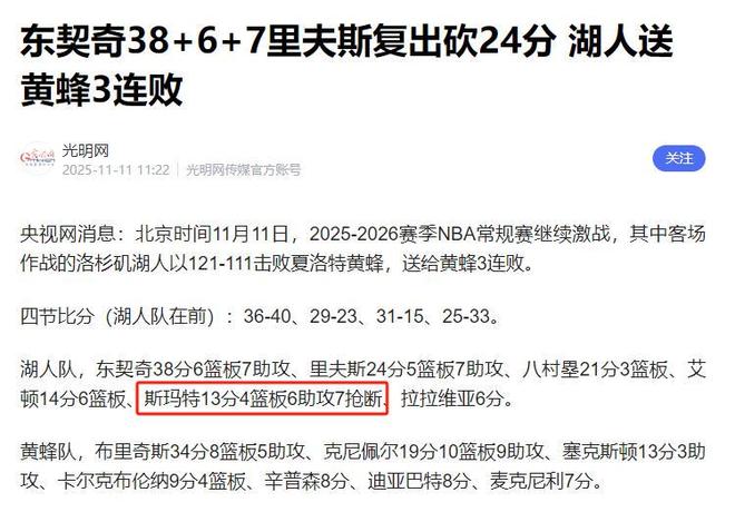 全場狂攬7次搶斷,不僅刷新瞭他個(gè)人加盟湖人後的單場新高,更直接登頂本賽季聯(lián)盟單場搶斷榜,同時(shí)追平湖人21世紀(jì)以來的單場搶斷紀(jì)錄。