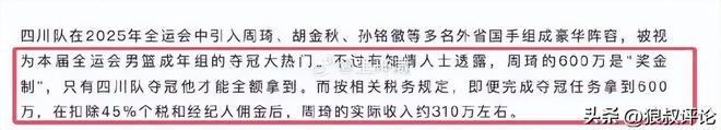 隨後,據(jù)新民晚報記者李元春報道,周琦與四川男籃的六百萬是“獎金制”,隻有四川隊奪冠他才能全額拿到。而且按相關(guān)稅務(wù)規(guī)定,即便完成奪冠任務(wù)拿到600萬,在扣除45%個稅和經(jīng)紀(jì)人傭金後,周琦的實(shí)際收入約310萬左右。