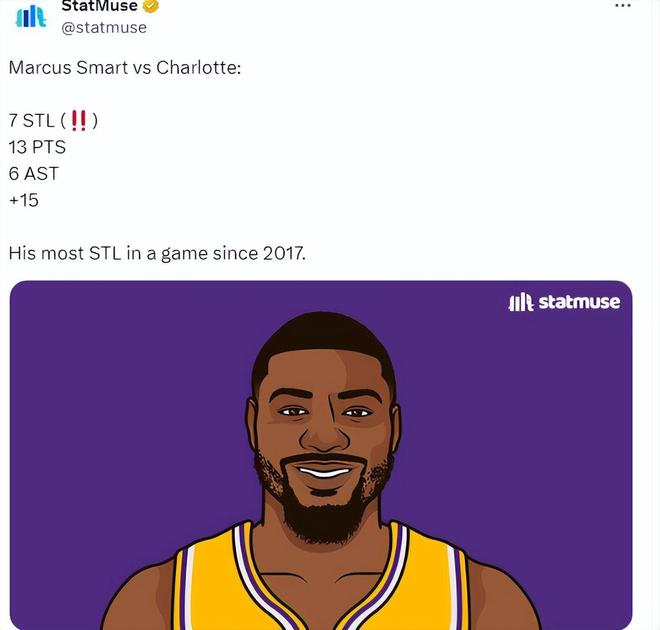 斯馬特的7次搶斷創(chuàng)造瞭一系列紀(jì)錄。單場7次搶斷是斯馬特湖人生涯最高,他的生涯紀(jì)錄是8次搶斷,同時也是斯馬特自2017年以來的單場最高搶斷數(shù)。7次搶斷是本賽季聯(lián)盟單場最高搶斷數(shù)。