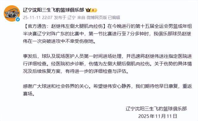 11月11日深夜22點07分,遼寧男籃官方通過社交平臺發(fā)佈瞭趙繼偉的初步傷情檢查結(jié)果,遼寧男籃在通報中是這樣說的——
